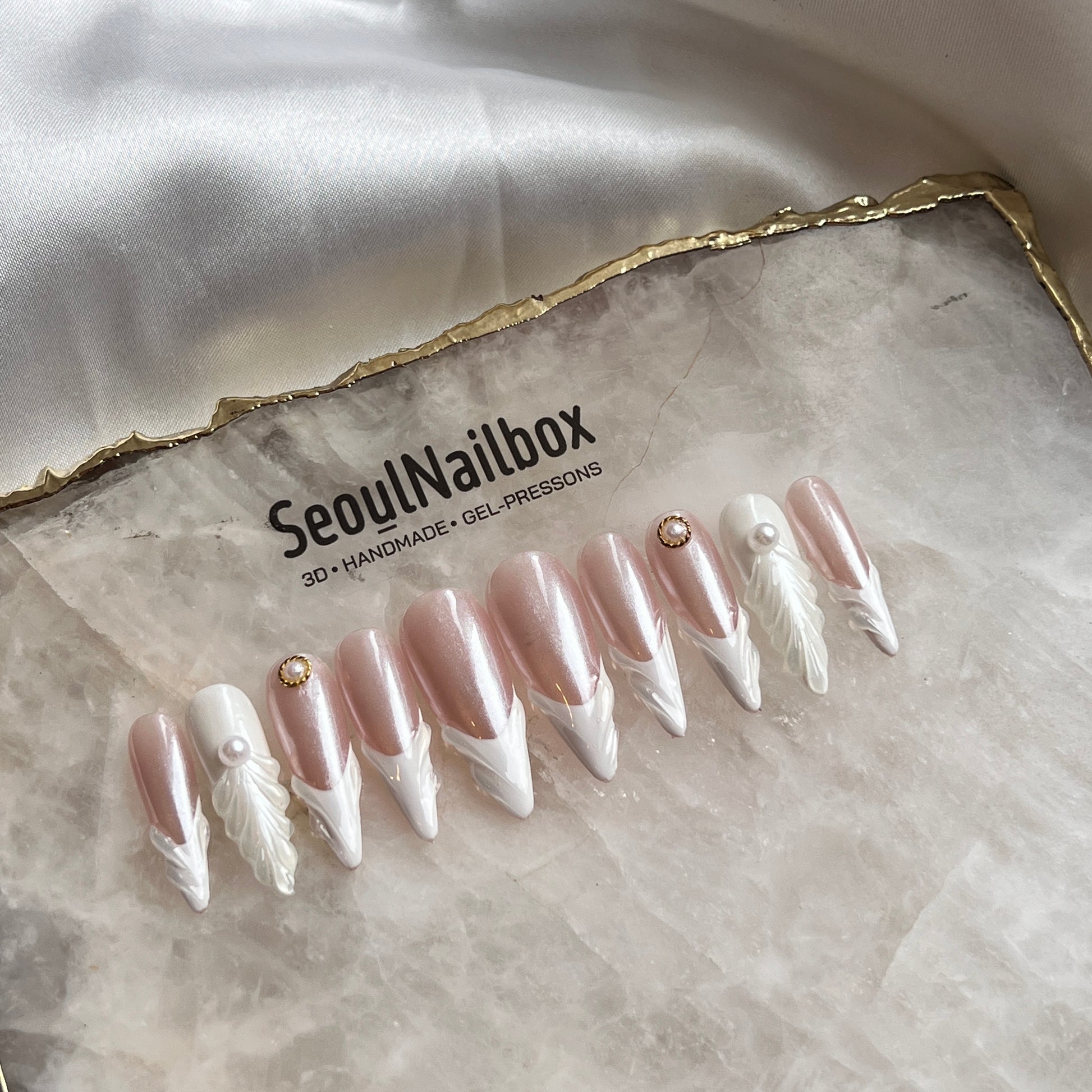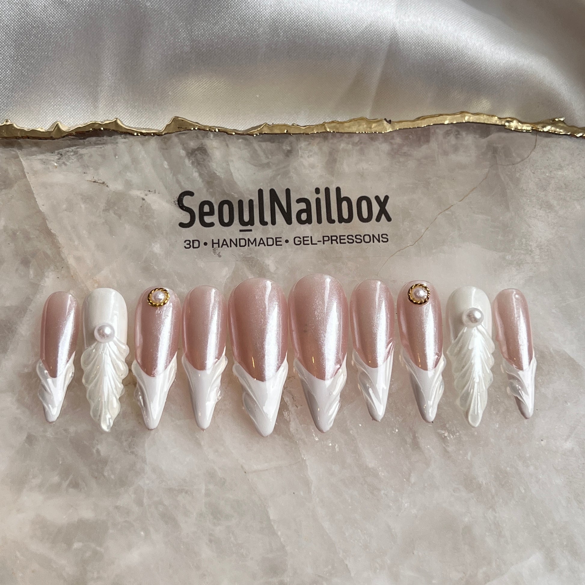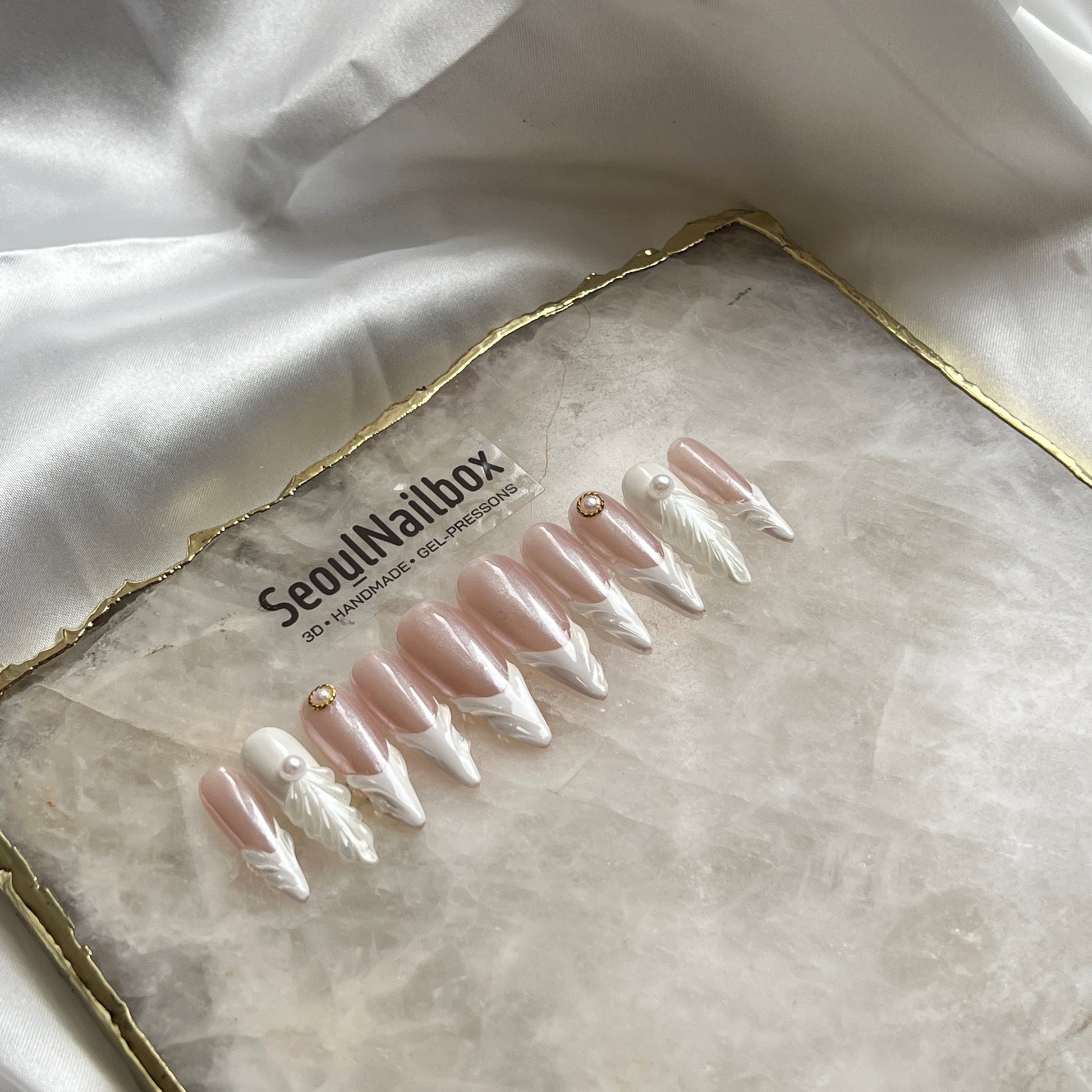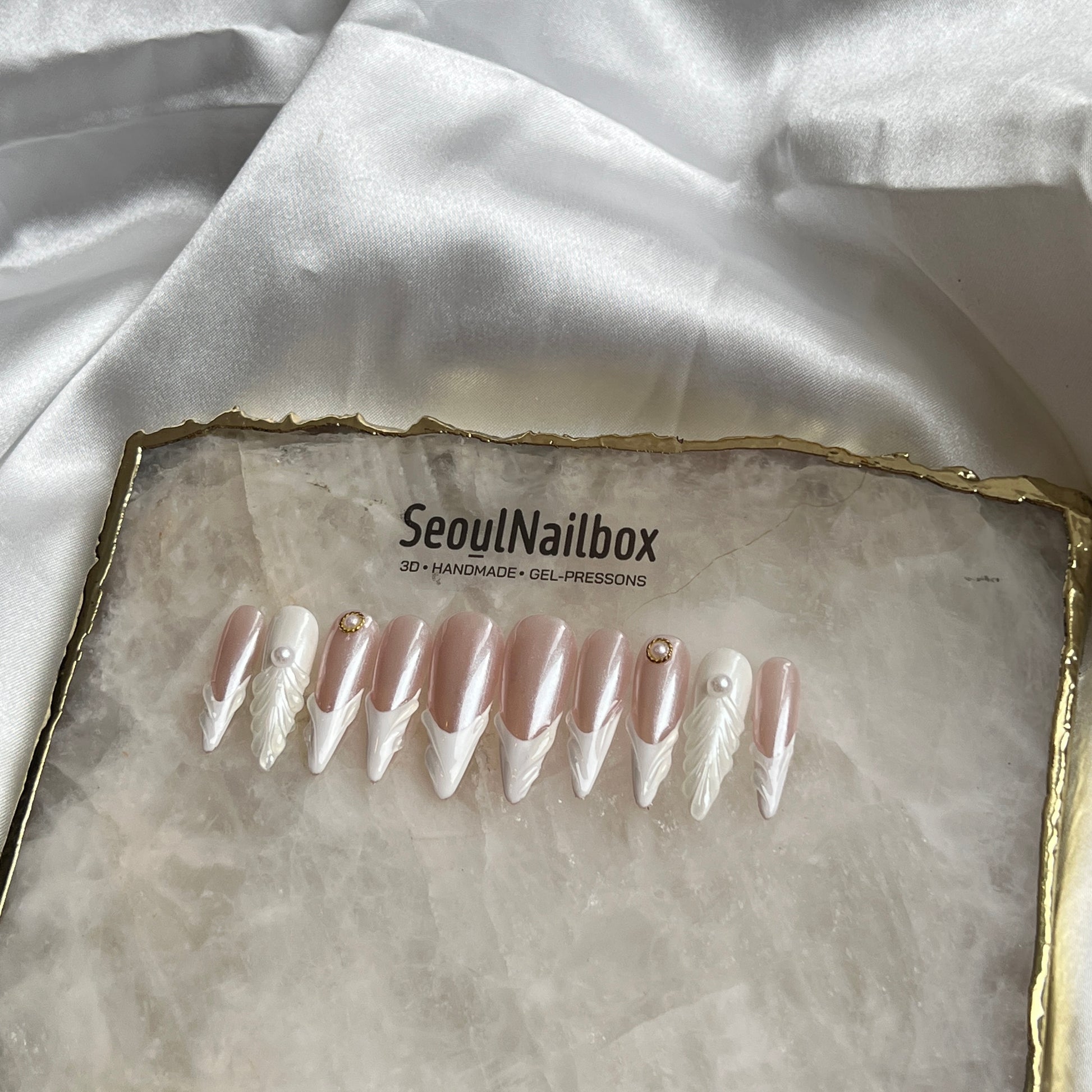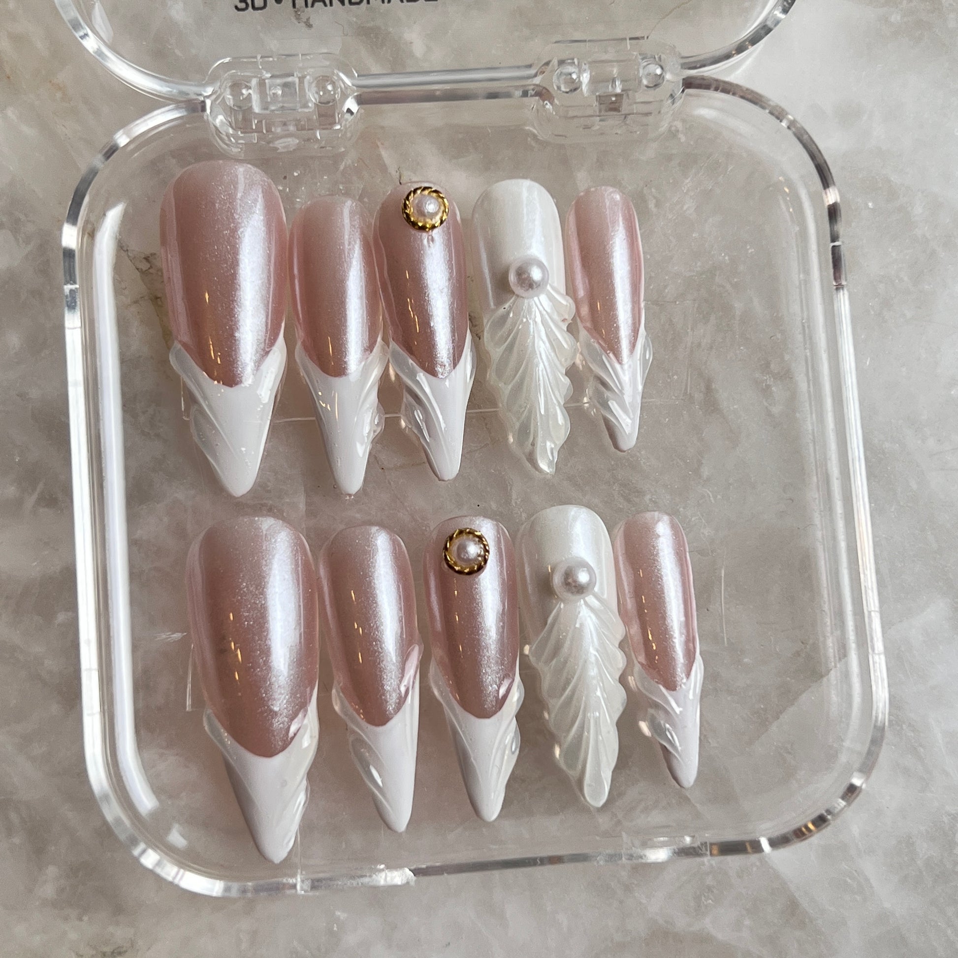 Unsere Elegant Bridal Press-Ons verkörpern pure Raffinesse und Luxus. Das zarte, perlmutt-schimmernde Rosé trifft auf eine stilvolle, weiße French-Spitze, veredelt mit 3D-Blatt-Details, Perlen und funkelnden Steinchen. Perfekt für Bräute oder besondere Anlässe – diese handgefertigten Gel-Pressons verleihen deinen Händen einen eleganten, romantischen Look. 🤍✨