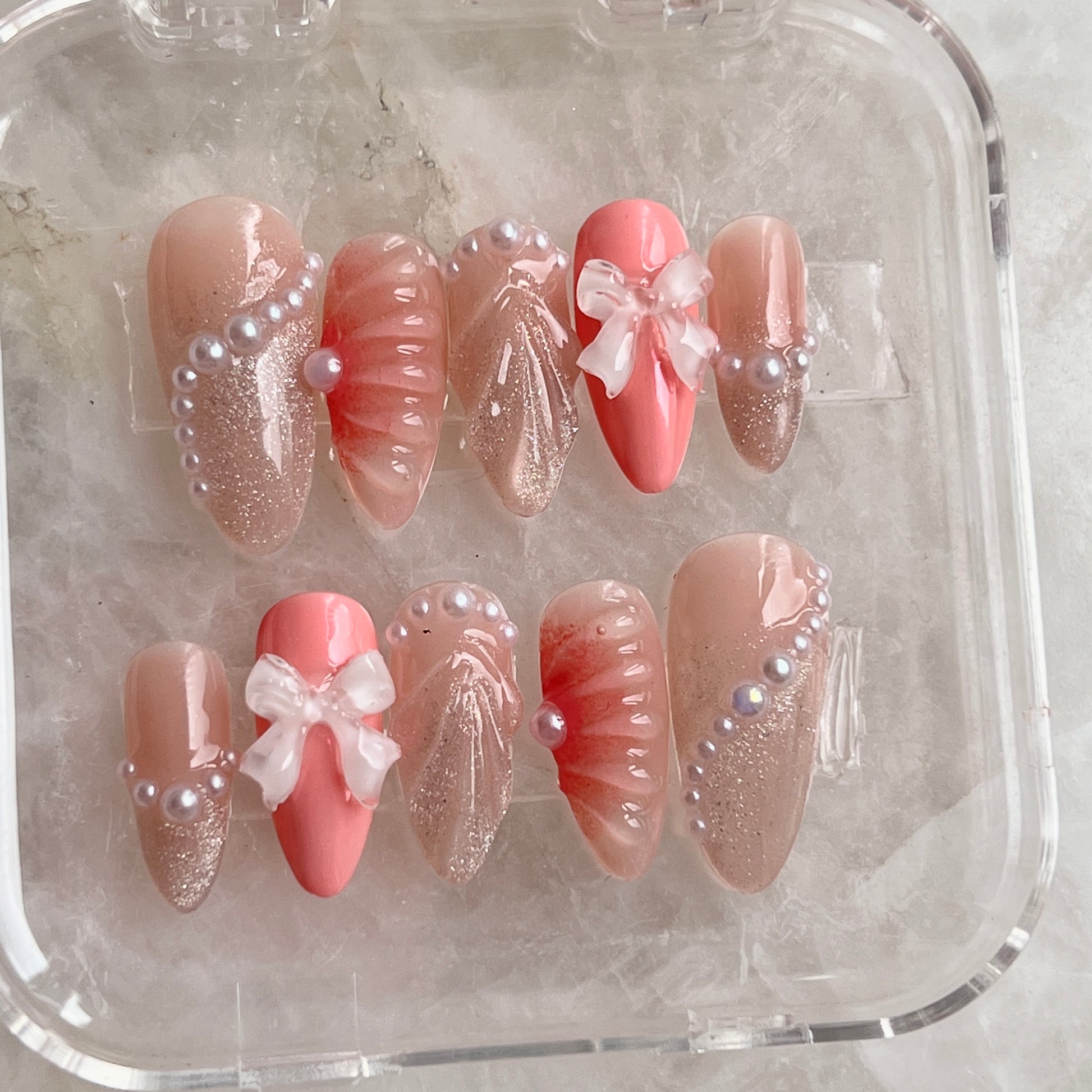 Die Rosy Pearl Elegance Press-Ons strahlen feminine Eleganz mit einem Hauch von Glamour aus. Der warme Nude- und Roséton wird durch funkelnden Glitzer, perlmuttfarbene Perlen und filigrane 3D-Schleifen veredelt. Zarte Marmoreffekte und glänzende Akzente sorgen für einen luxuriösen, individuellen Look – perfekt für besondere Anlässe oder einfach, um deinem Alltag einen edlen Touch zu verleihen. 🎀✨💫